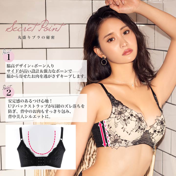 ブラはサイドが高い設計で脇から寄せたお肉を逃がさずキープ。