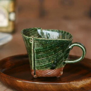 陶器・食器の通販ショップ【また壱陶房】の「和食器 マグカップページ」へようこそ!! m53 織部張り合わせ マグカップ 癒やしの織部色・・ サイズ 横 約10cm 手無しサイズ 縦 約9.5cm 高さ 約8.5cm 重さ 約260g 八分目で約220cc 使用注意:手洗い○ 電子レンジ温め○ オーブン・直火× 食器洗い機○ 折紙みたいなふわふわした形・・ ※一点の商品価格です。