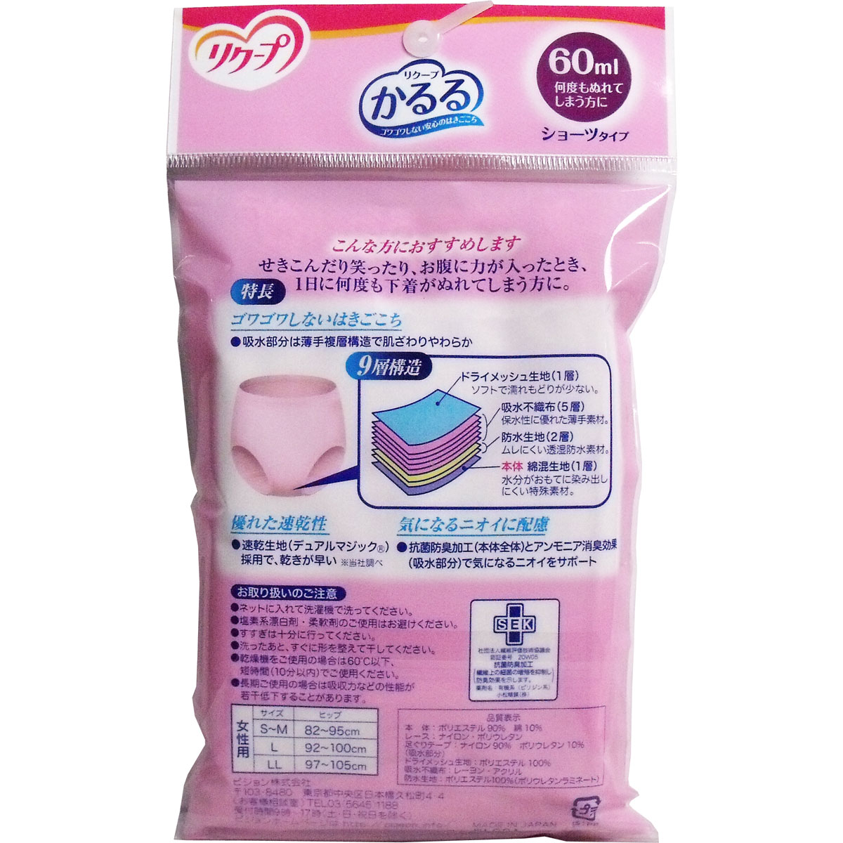 【ポイント2倍】4902508114615 ピジョン リクープ かるる 60mL ショーツタイプ ピンク S−Mサイズ 1枚入【キャンセル不可】 失禁パンツ かるる60mlショーツタイプ 女性用